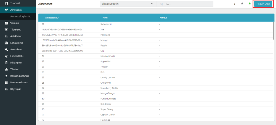 Aiemman Excel-tuontimenetelmän sijaan ainesosia voidaan nyt lisätä taustalta. Tämä tapahtuu valitsemalla Ainesosat > Lisää uusi. Perustiedot (mukaan lukien ainesosan kuva), kategoriat, hintatiedot sekä mittatiedot toimivat samalla tavalla kuin varastotuotteissa. Ainesosaa muokattaessa voidaan valita, mitä allergeeneja ainesosa sisältää. Punainen tarkoittaa, että ainesosa sisältää allergeenia.