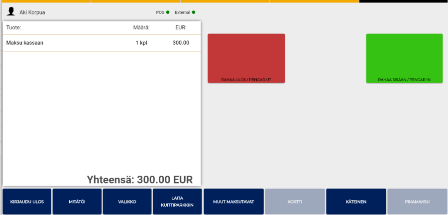 Jos työasemalle on konfiguroitu useampi valuutta, voidaan avoimen hinnan tuotteita myytäessä sekä maksu sisään / ulos -toiminnoissa vaihtaa syötettävä summa eri valuuttaan. Tällöin kuitin voi maksaa vain valitulla valuutalla.