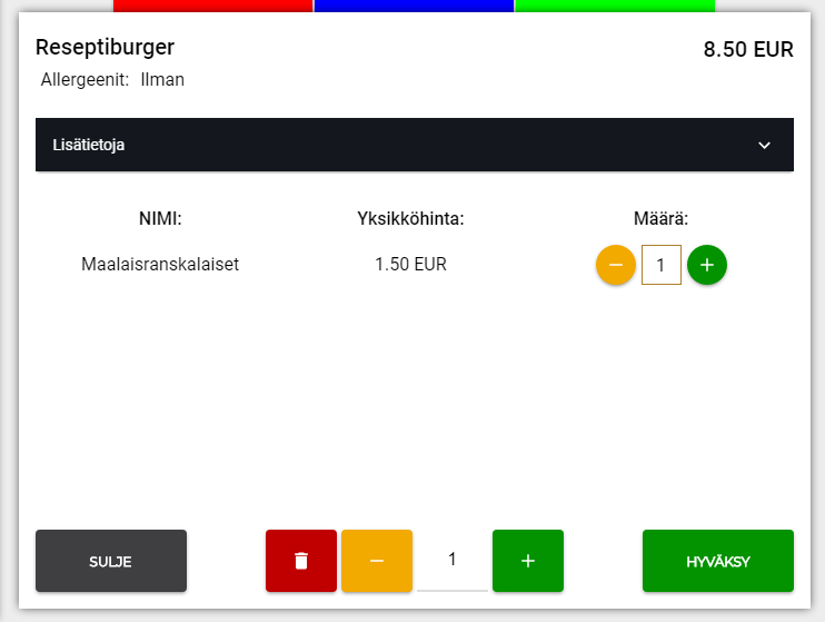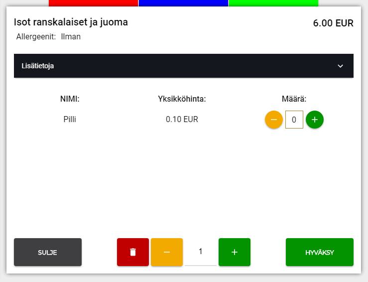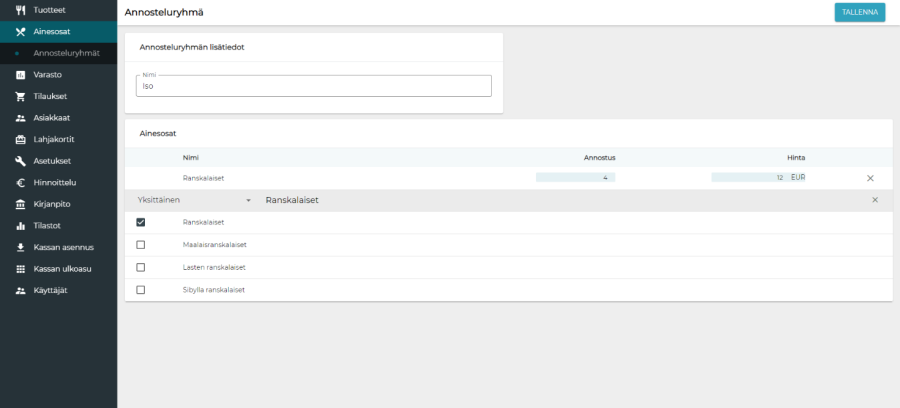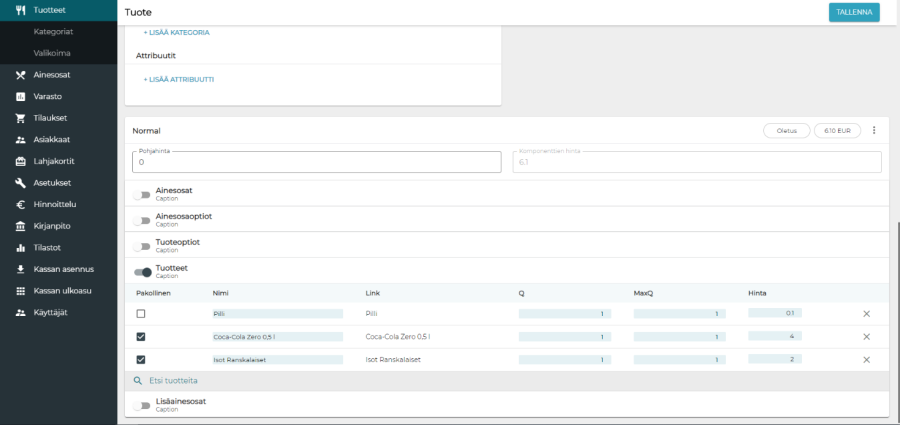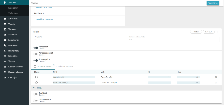 Oletuksena tuotteella on yksi koko, jonka nimi on "Normal" ja hinta 0.00. Kokoon voi lisätä ainesosia, ainesosaoptioita, tuoteoptioita, tuotteita sekä lisäainesosia. Näiden ominaisuuksien vieressä olevilla kytkimillä on tarkoitus helpottaa ylläpitoa: kun ominaisuus on tuotteella käytössä, kytkin laitetaan päälle. Tällöin nopealla vilkaisulla näkee, mitkä ominaisuudet tuotteella ovat käytössä. Ainesosaominaisuudella voidaan käyttää joko valmiiksi tehtyä annosteluryhmää tai asettaa annostelutiedot manuaalisesti valitsemalla "Annostelu"-kohtaan "Manuaalinen". Ainesosalle voi asettaa oletusmäärän (Q) ja maksimimäärän (Max Q). Ainesosat voidaan määritellä kokoon pakollisiksi tai muokattaviksi myytäessä lisättäviksi. Pakollisten ainesosien ominaisuuksia ei voi muuttaa. Muokattaviksi määriteltyjen tuotteiden määrää voidaan muokata kassalla. Yllä olevan kuvan määrittelyt näkyvät kassaohjelmassa seuraavasti: Ainesosaoptiot ovat kassalla valittavissa tuotetta myytäessä. Ainesosaoptiot voivat olla joko pakollisia tai valinnaisia ja optioiden sisällä voidaan valita oletusvaihtoehto. Esimerkiksi pizzaa myytäessä pohja voisi olla pakollinen, mutta juusto ei:
