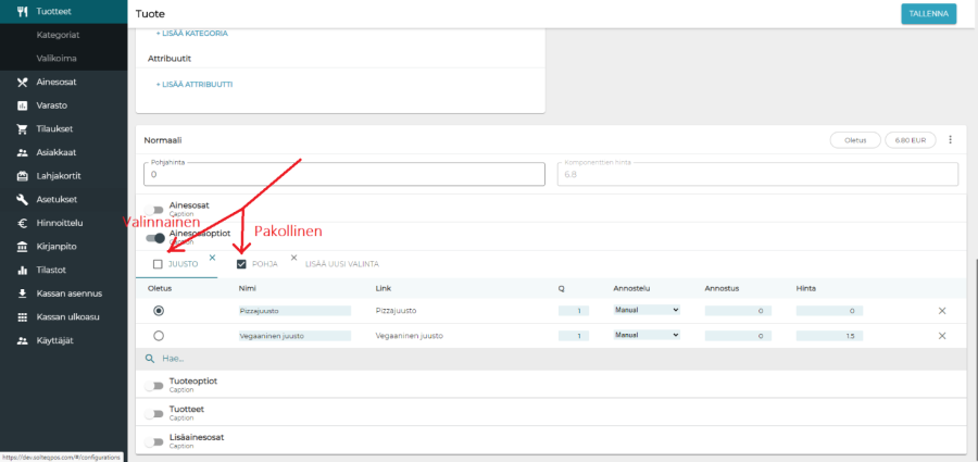 Kassalla tuotetta myytäessä juuston kohdalla on siis valittavissa myös "None", sillä juustoa ei ole määritelty pakolliseksi taustapalvelusssa: Yksi ainesosaoptio voisi siis sisältää esimerkiksi usean vaihtoehdon, kuten erityyppiset pizzapohjat tai juustot. Optioilla voidaan siis rakentaa muokattavuutta tuotteen perusreseptin ympärille. Tuoteoptiosta esimerkki voisi olla ateriaan kuuluva juoma. Se ei ole ainesosa eikä siksi osa reseptiä, ja asiakas voi valita sitä vain yhden. Tuoteoptioista yksi voidaan asettaa oletuksena valituksi. Tuoteoptio voidaan asettaa pakolliseksi tai valinnaiseksi. Tuotteet-kohdassa voidaan rakentaa esimerkiksi tuotekombo: ostaessaan kyseisen tuotekombon asiakas saa tuotteet eri hinnalla kuin ostaessaan ne erikseen. Tässäkin kohdassa tuotteita voi asettaa pakollisiksi tai valinnaisiksi. Pakolliseksi asetettuja tuotteita ei voi muokata eikä poistaa kombosta. Valinnaisiksi asetettujen tuotteiden määrää voi muokata, mutta hintaa ei.