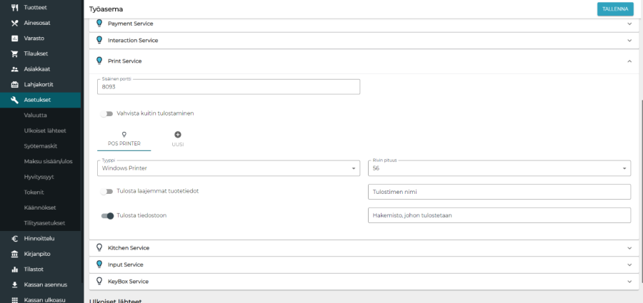 Kuitit on nyt mahdollista tulostaa oletuksena PDF-muotoon. Tämän ominaisuuden saa päälle valitsemalla taustapalvelusta Asetukset > Haluttu työasema > Print Service. Sitten asetetaan "Tulosta tiedostoon" -kytkin päälle. "Hakemisto, johon tulostetaan" -kohtaan voi syöttää hakemiston polun, johon tahdotaan kuitin tulostuvan. Oletuksena kuitti tulostuu C:\temp-hakemistoon, joten kohdan voi myös jättää tyhjäksi.