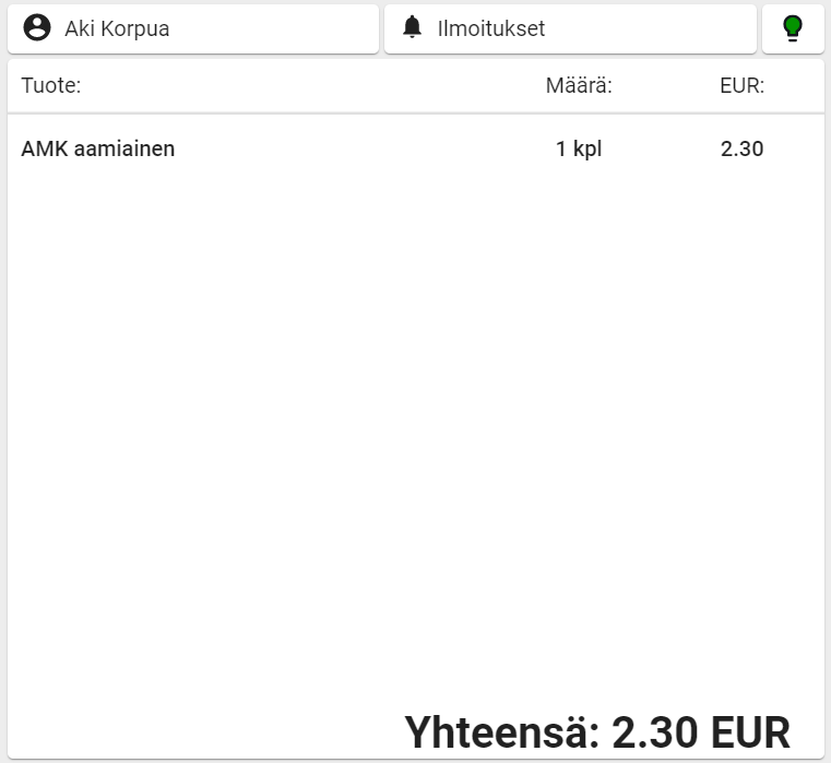 Luo tarvittavat ateriatuotteet esim. AMK Aamiainen 2.30€ ja AMK Lounas 5.00€