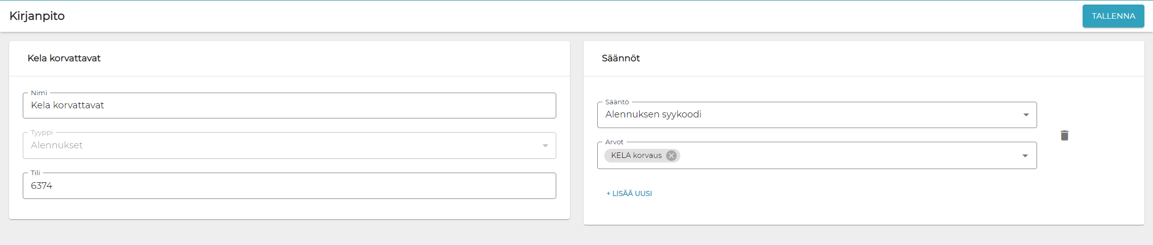 Kirjanpitoa varten voidaan KELA-korvaussummat ohjata omalle tililleen: