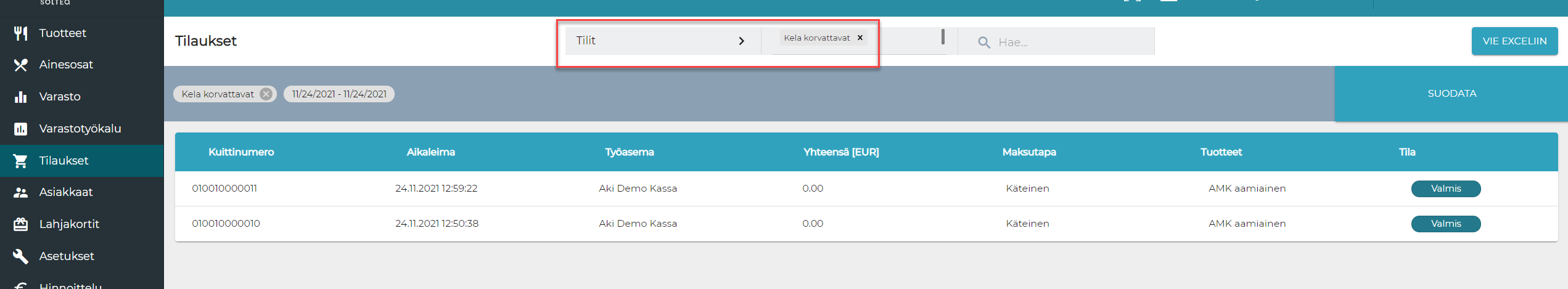 Klikkaa Vie Exceliin viedäksesi raportin Exceliin.