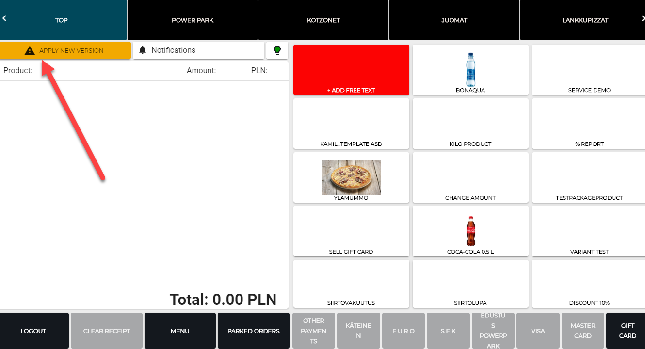 Kassan käyttöliittymä (jos päivitys oli saatavilla). Kun kassapalvelu on päivittänyt itsensä, kassan käyttöliittymä käynnistää itsensa uudelleen automaattisesti ja ottaa uuden version käyttöön. Yleensä tämä kestää 3 sekuntia.